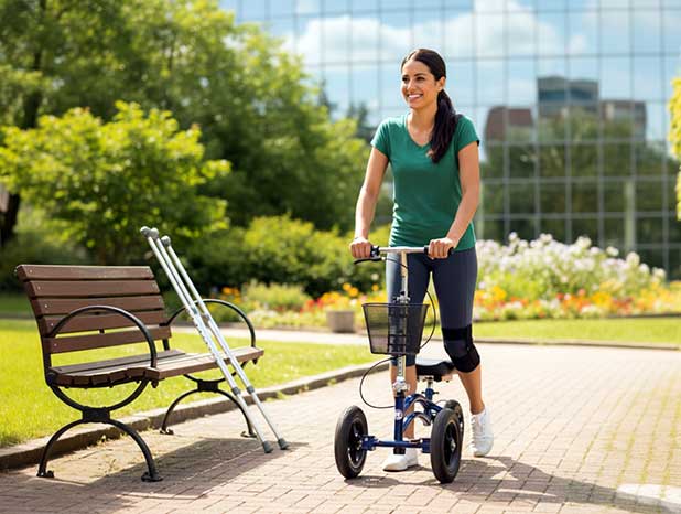 "I'm a single mom with two kids under five. Crutches meant I couldn't cook or carry them. The knee scooter saved me, I could hold my daughter's hand, carry dinner plates, and keep up with the kids." (Emily R., meniscus repair, February 2024)